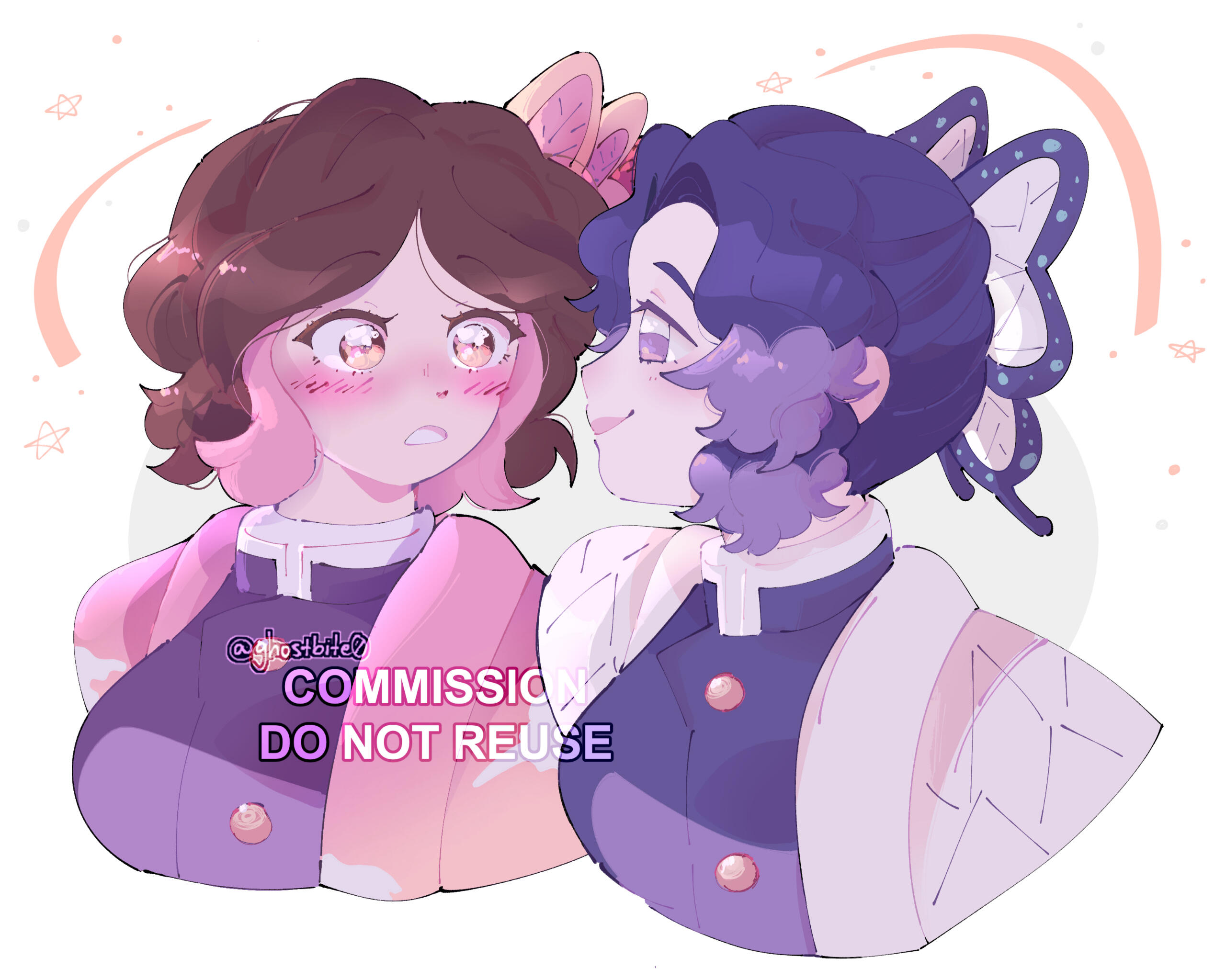 Butterfly Girls | 8 x 9 in (2024) The client commissioned me to draw her character with Shinobu Kocho from Demon Slayer. I experimented with purple and pink palettes Clip Studio Paint